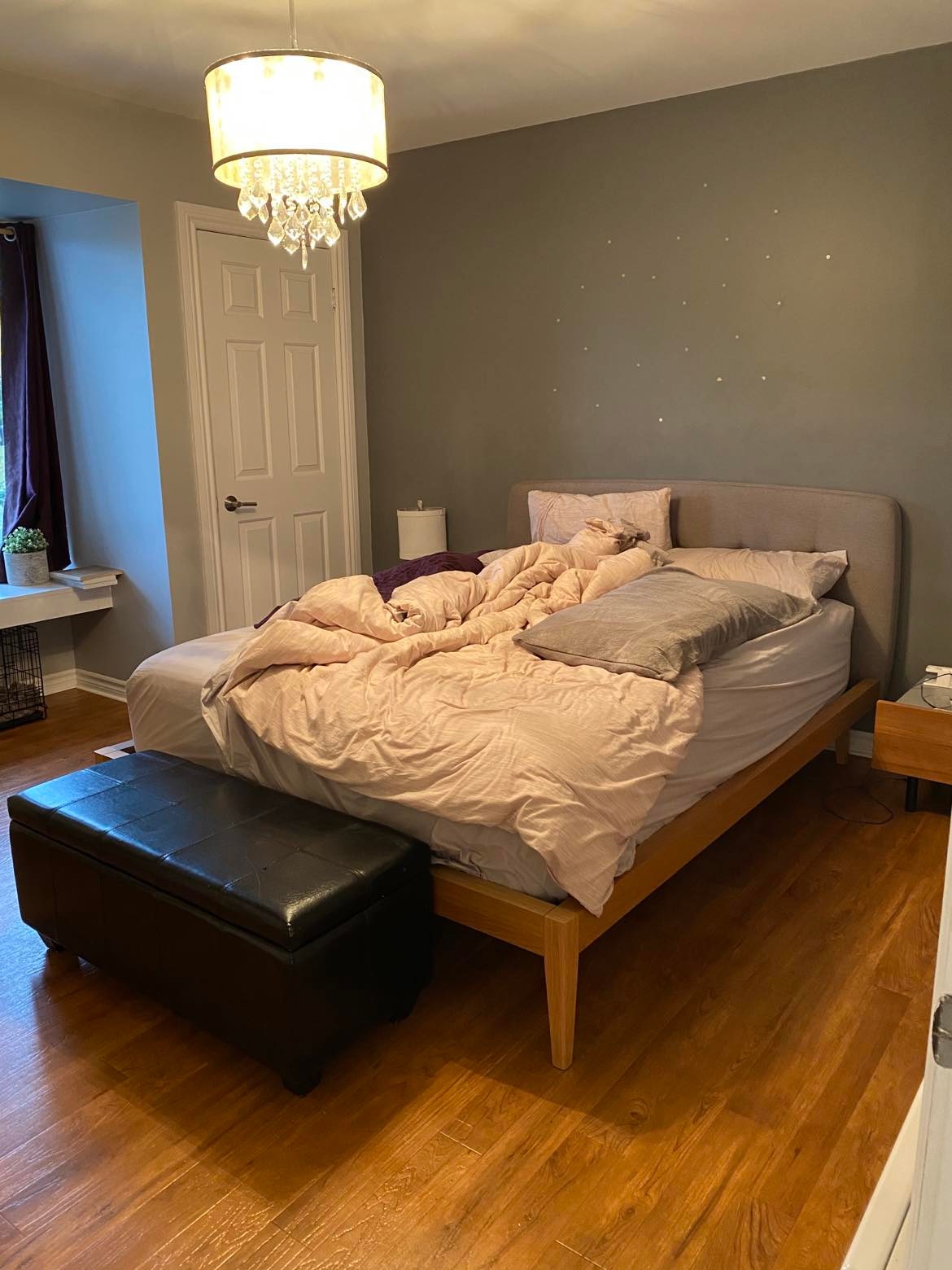 La démolition du garde-robe nous a permis d’agrandir la pièce et de créer une tête de lit personnalisée. Les deux tablettes qui servent de meubles d’appoint sont pratiques, mais surtout très belles!