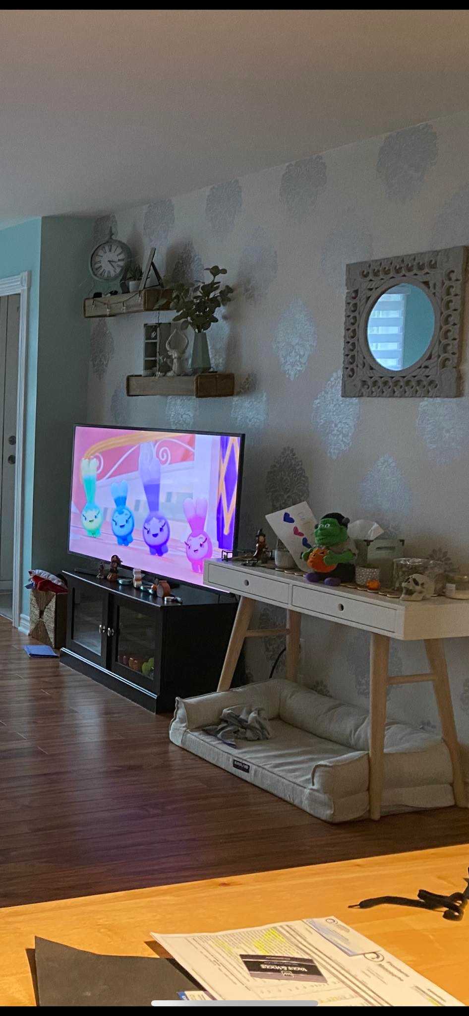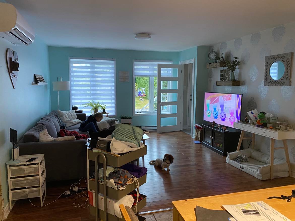 La construction de cette unité murale nous a permis d’installer un foyer en plus de cacher les fils de la télévision! Un bel ajout comme pièce centrale de la maison.