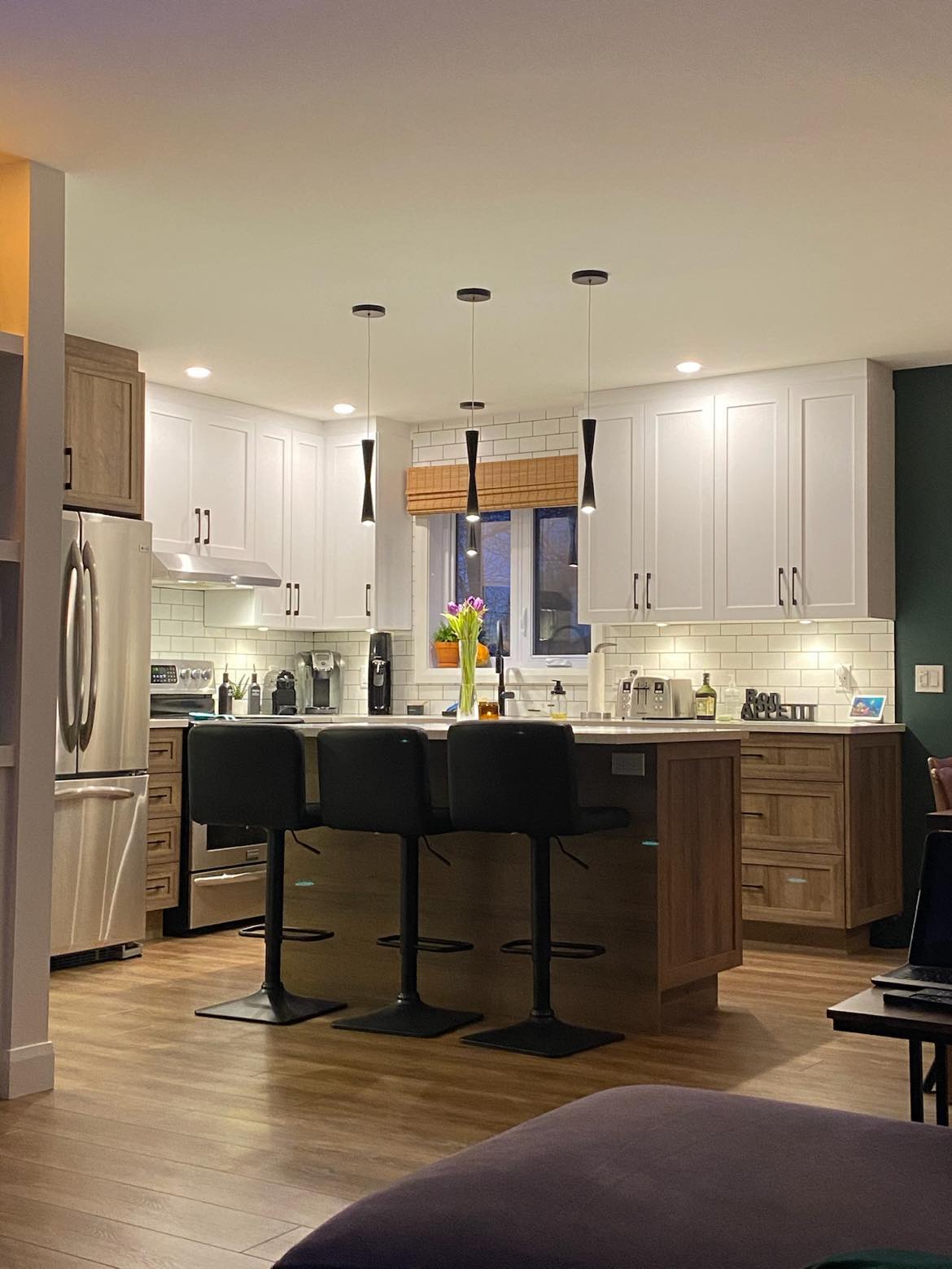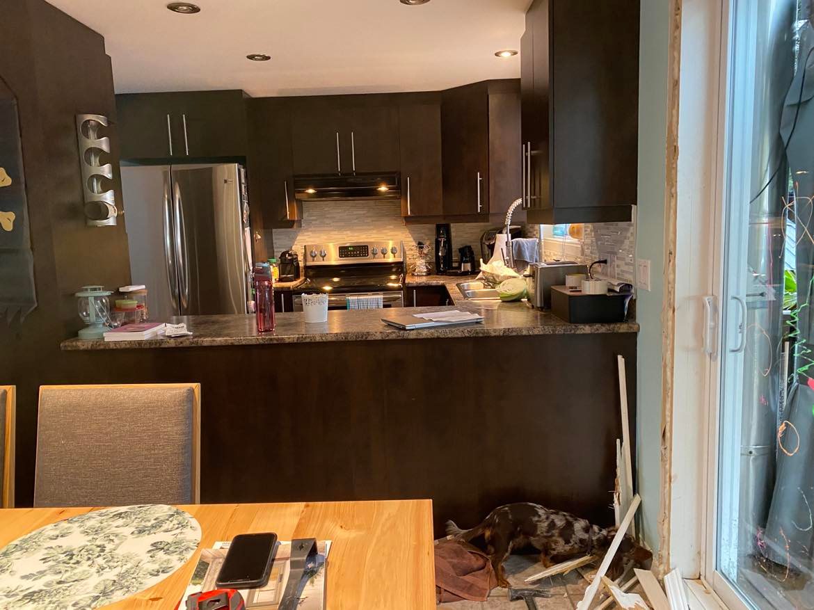 Cette rénovation complète de cuisine nous a permis de réaménager l’espace pour en maximiser l’utilisation et d’y ajouter un bel ilot!